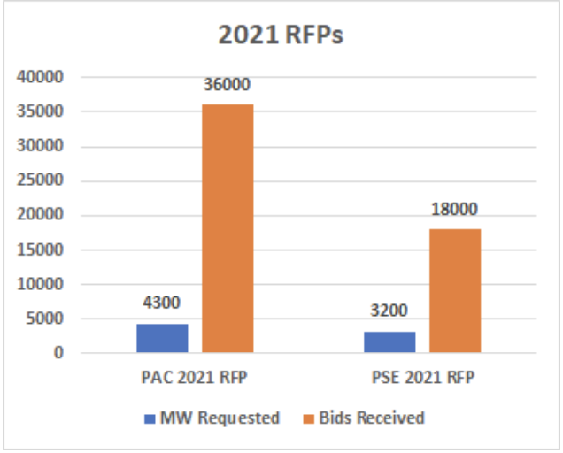 In 2021, Puget Sound Energy (PSE) issued another RFP for 3200 MW of energy to be available to them by end of 2025. The responses showed that there were over 18,000 MW of renewable energies either already available, or woul dbe available by 2025.